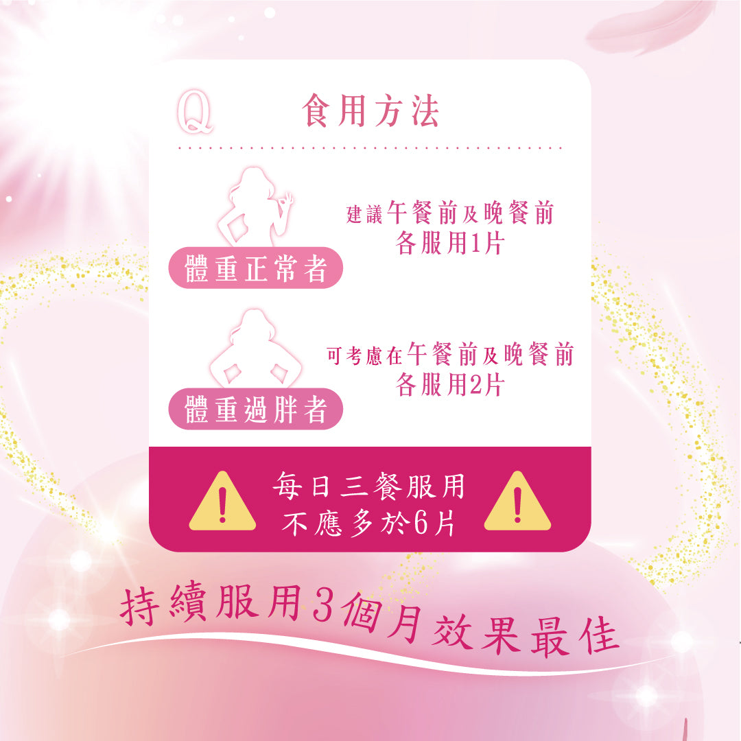 午餐前及晚餐前各服用 2 片,每日三餐服用不應多於 6 片。持續服用 3 個月效